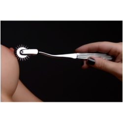 Chaque détail de la Roue à Picots Odax a été pensé pour votre plaisir. Sa tête épinglée roulante est dotée d'une rangée de broches pointues régulièrement espacées qui tournent en douceur lorsqu'elle roule sur la peau. Cette conception sournoise offre une sensation unique et inoubliable.
