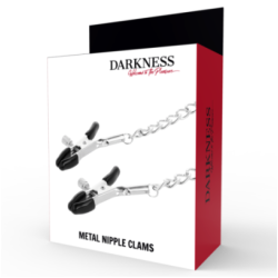 Pinces à tétons réglables en métal Darkness, un accessoire unisexe pour une stimulation supplémentaire. Fabriquées en acier inoxydable et aluminium, sans nickel.