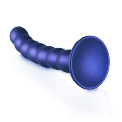 Dildo en silicone haut de gamme, 16.4x2.5cm, bleu métallisé, avec perles pour stimuler le point G. Compatible avec harnais Ouch.